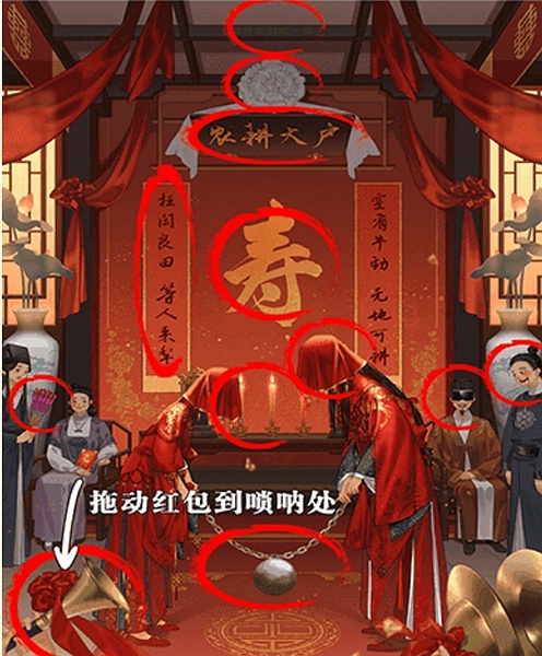注意:线索唢呐需要把左边椅子上的女人手中的红包移动到唢呐的位置才会触发。