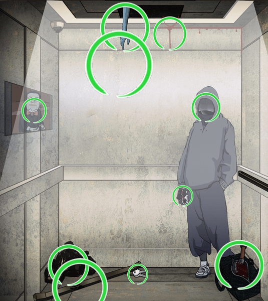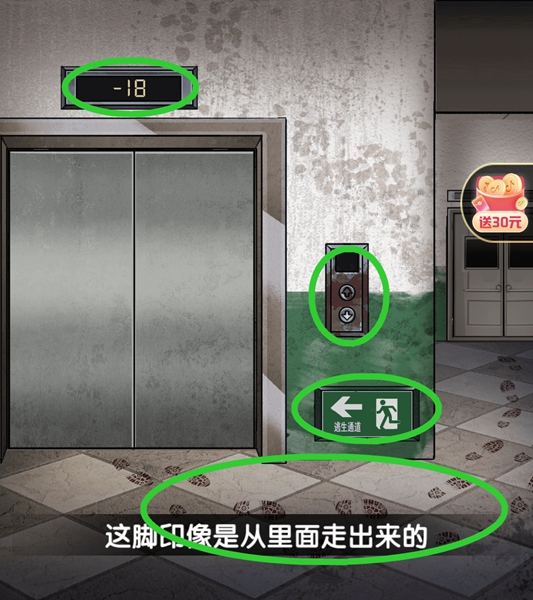 注意:【抓痕】需要点击两次电梯扶手。【手】【故障灯】需要点击两次通风口。