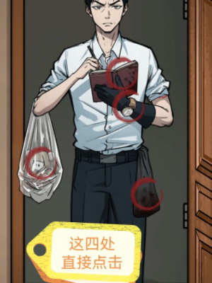 1、首先我们在案发现场找到线索和诡异的地方:带血的锤子、鸭舌帽、小丑面容、胳膊上的牙印、地上的小熊玩偶。