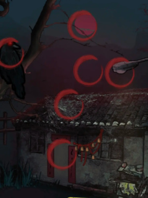 1、首先进入游戏我们在场景中找到显眼的诡异点:闪烁的路灯、红色的月亮、奇怪的对联、红眼的乌鸦、布满蜘蛛网的屋顶。
