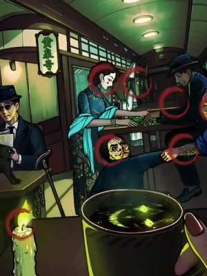 3、阴间场景我们接着找到这些诡异点:向右滑动老婆婆手袖发现动物手臂、向右滑动老婆婆的脸发现猫脸老太、双击正在被老婆婆拉走的小孩是瘦小太公、点击打麻将的纸人贵妇、点击蜡烛上的绿色火焰、点击西装男前面的触手。