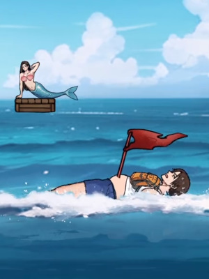 3、最后出现美人鱼之后我们点击美人鱼的尾巴,直接拖动男生腿上快速游回岸上完成通关。