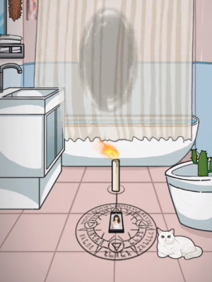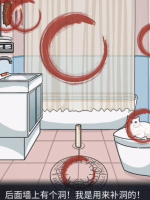 1、首先我们先找到于是中的诡异点:地上的圆形法阵、马桶上的猫、墙上的筷子和鸡毛掸子、拉起来的浴帘。