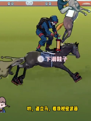 1、首先我们上划选手让他站在马上,然后再把背包里面的打气筒给马打气。再把选手的轮子鞋给马穿上。