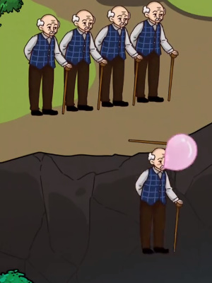 2、把躺椅下面的烫坏给老爷爷,长按帮助他跳过去,然后再把泡泡糖给老爷爷,吹成气球飞过去。