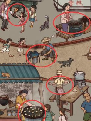 1、点击春卷,把春卷放到早市旁边的老奶奶这里,然后把烤鸭给右上角的店铺这里,再把糖人给中间骑车子的人。