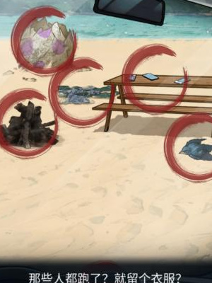 1、首先我们来到场景一这里,找出沙滩上的危险点:残留的灰烬,地上的衣服,破碎的蛋壳,落下的手机。