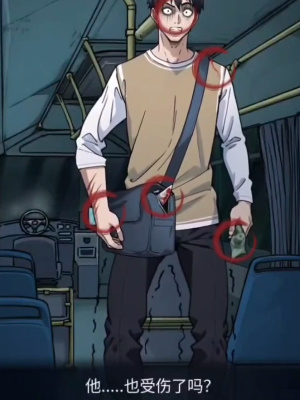 2、等上来另一位男乘客的时候,点击他身上的诡异点:表情扭曲、手上的手帕、肩膀上红色长发,滑动包打开找到带血的刀,上滑衣袖找到抓痕。