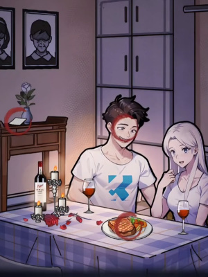 2、来到场景二之后,我们找到下面这些可疑点:男生的笑容、牛排、桌上的手术单、地上的手术刀,左滑女生后面的柜子,找到麻药。