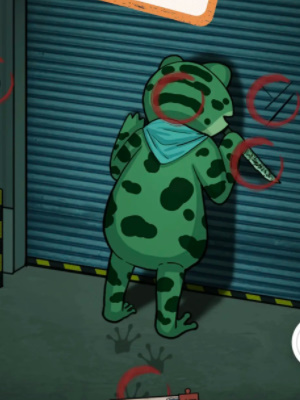 4、下一个青蛙人找到她身上的异常点:玩偶服、竖瞳、手上的绿色记号笔、地上的绿色脚印。