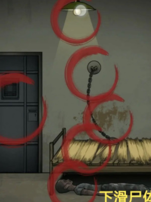 3、来到场景三,我们点击这些奇怪点:破木床、染血锁链、锁上的铁门、墙上的血迹、诡异的尸体、屋子里的灯等困境。