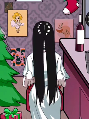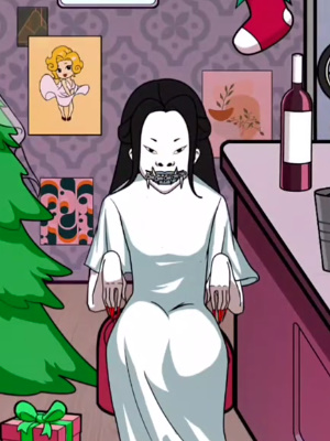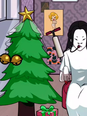3、移动打气筒到女生嘴巴上,然后往里面打气,再把圣诞树上面的两个铃铛放进女生眼睛里面。