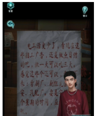 13、返回招待所,查看招待所墙上的兼职广告,根据兼职工作线索和兼职广告得到失物招领箱的密码为3752,获得保险丝。