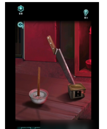 5、然后点击一旁的桌子,获得菜刀,使用菜刀撬开立着的筷子旁边的罐头,获得里面的糖瓜。