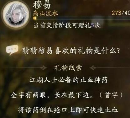 射雕手游穆易喜欢什么礼物?送哪些礼物好感度高?很多玩家都不太清楚穆易要怎么送礼,下文一起来了解一下吧。