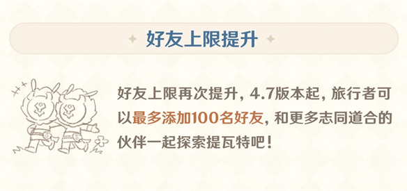 而好友上限数量提升至100这个改动,对于某些喜欢社交的原神玩家来说,也是一个不错的改动。毕竟原神是可以四处串门的,对于那些喜欢到其他玩家的世界里整活的玩家来说,好友数量的上升意味着他们整活的范围又扩大了,又可以和其他原神玩家一起进行头脑风暴了。