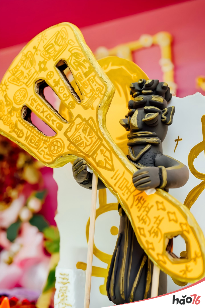 一位玩家带来了令全场瞩目的、被他称为“三星堆青铜神铲”的作品。在交换区徘徊许久后,他总觉得自己的铲子少了些色彩与纹样,未能完全表达心意。最终,他决定回家重新打磨上色,将游戏中的“铲子”与古蜀文明的青铜纹样相结合,用特殊的金属颜料和做旧工艺,复刻出充满神秘感的青铜质感与绿锈。第二天再次返回活动现场,他这把连接着数千年古蜀文明与当代电竞精神的铲子一出现,便成为了全场焦点,也成为了不同圈层文化碰撞的绝佳象征。
